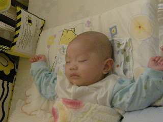 不過隨著她喜歡在床上蹭阿蹭、蹬阿鄧的把自己不停的往上推進,所以後腦杓最常摩擦的部份,胎毛幾乎都掉光了,但象徵剃頭的那撮特別長..新生的頭髮跟原本的頭髮長度參差不齊,髮型實在有點像是被狗啃的,所以今天出門就帶她去剃光光~讓頭髮重新長~所以家裡就突然多了一個光頭小寶貝了(笑)!